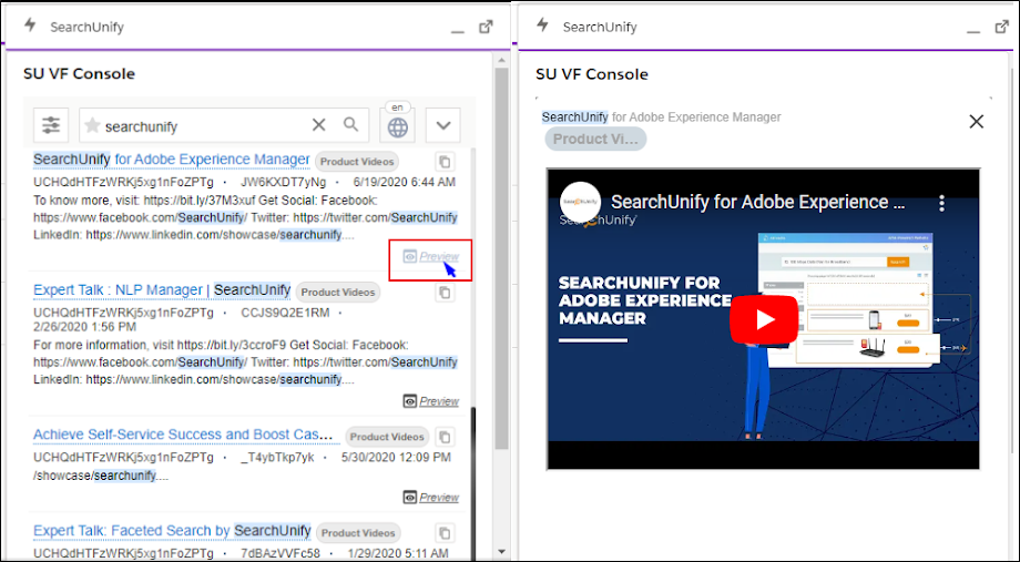 Fig. A snapshot of the Preview function on a Salesforce Console search client. The content source is YouTube.