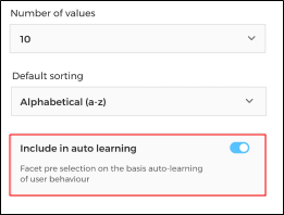 If you have toggled on Pre-Selection of Facets, you will see an additional option: Include in auto-learning.. Enabling this option displays search results that align with the end user’s previous facet selection patterns.