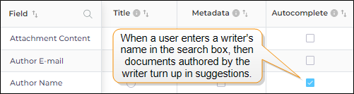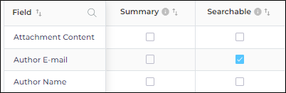 A searchable field is where the search client looks for data. In the next image, Author Email is searchable but Author Name isn't. It means you cannot find a document through its Author Name because the search client looks for matches only in the Author Email field.