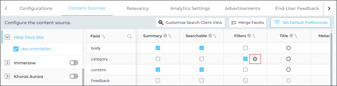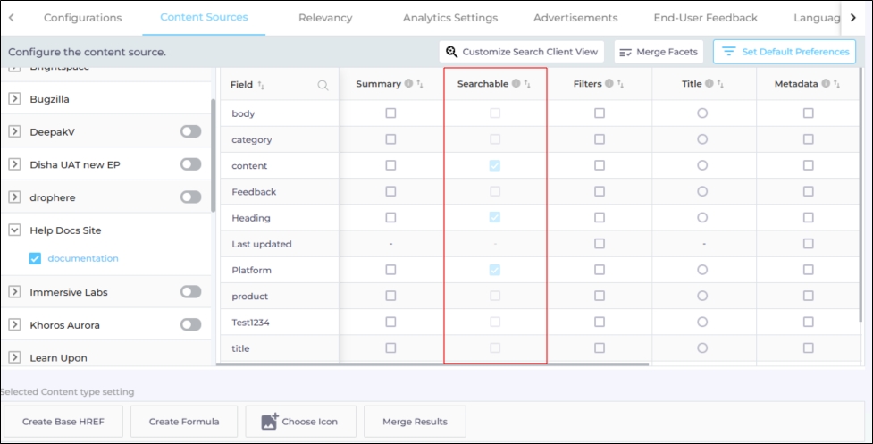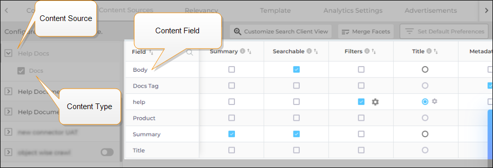 To view the content fields, click on a content source and then a content type. In the previous image, you can see the fields for the content source "Help Docs" and content type "Docs".