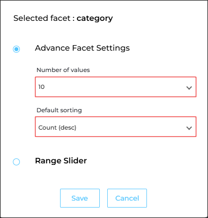 Fig. Snapshot of Advance Facet Settings when the admin wants to display 10 facet values and they are displayed in the descending order.