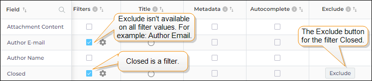 Exclude is related to Filters. When a field is picked as a filter, the Exclude button appears for that field.