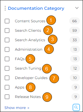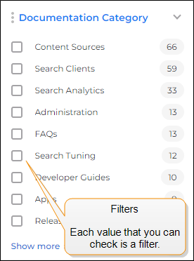 Advanced Facet Settings - These settings allow users to filter results by discrete metadata values, such as categories, author names, and tags. If a query returns a large number of results, users can select a filter value to display only the results that match the select value.