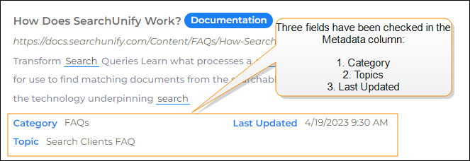The supplementary information sometimes accompanying search results is Metadata. It has a uniform appearance: {{field name}}: {{field value}}.