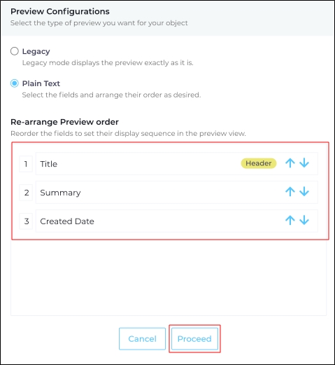 Use the arrows in the Re-arrange Preview Order to change the order of the fields. Also, the value in the first field is displayed as a header in the plain text preview.