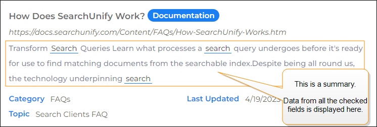A summary is the text below the title on a search result. Data from the checked fields appears in result summaries.