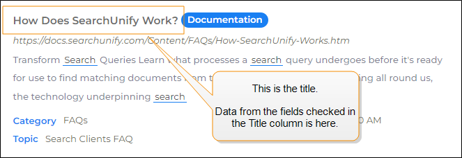 The checked fields appear in the result titles on a search results page. As with Summary, it is possible to check multiple fields to assemble a Title.