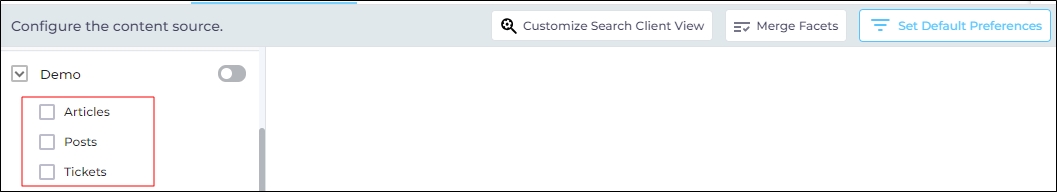 To remove the results from a content source, uncheck all the content source objects. For example, no results will be returned from the content source "Demo" because all its objects have been unchecked.