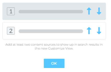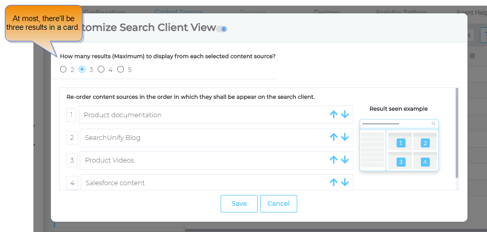 - Pick the number of maximum results to display in each card from How many results (Maximum) to display from each selected content source? Use arrows to Re-order content sources in the order in which they shall appear on the search client. Hit Save when done.