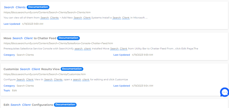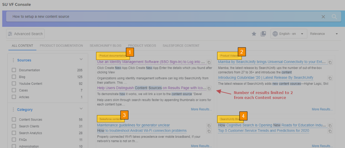 Customize Search Client View allows you to group search results by content sources. You can either stick with the default display where results from all content sources are presented as a list on the search results page. Alternatively, you can present results from each content source on a separate card. The next image shows the different.