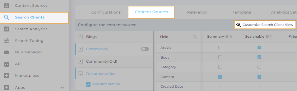 - In Search Clients, open a search client for editing, go to the Content Sources tab, and click Customize Search Client View.