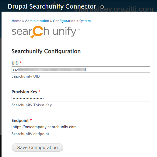 Search URL. Enter the page URL where you want to deploy the SearchUnify-powered search. E.g. https://{your drupal instance URL}/searchunify/search.