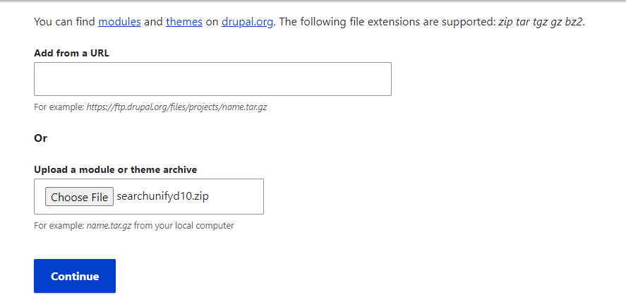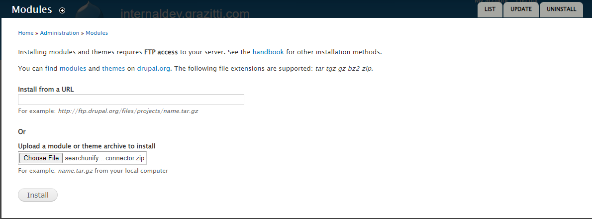 Upload the downloaded searchunify_drupal_connector.zip file here and click Install.