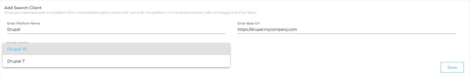 Note. Drupal 7 and Drupal 10 produce two separate zip files. Select the correct platform while creating a new search client.