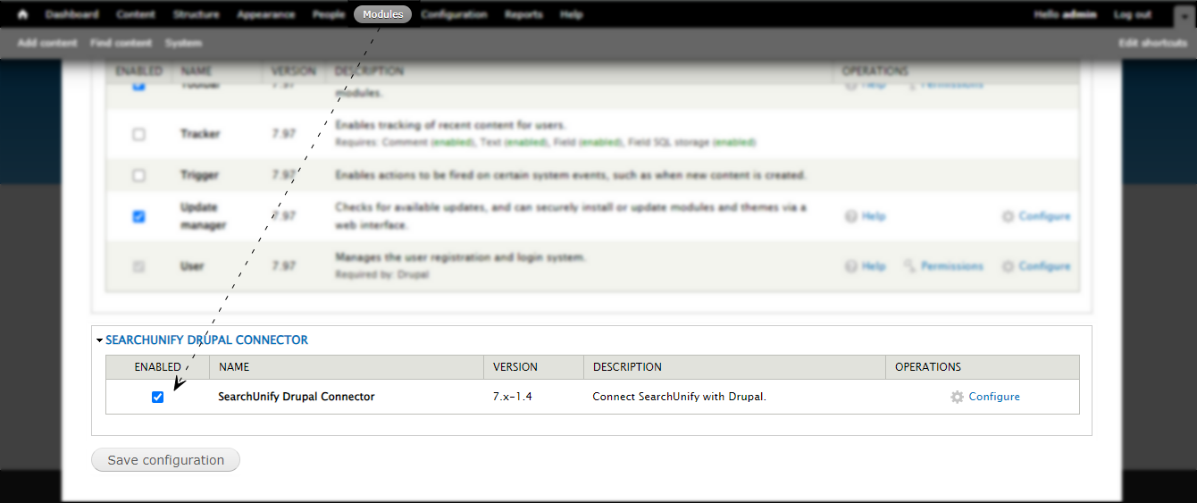 After the SearchUnify-Drupal Connector is installed, navigate to Modules, and enable SearchUnify Drupal Connector. Click Save Configuration to save the settings.