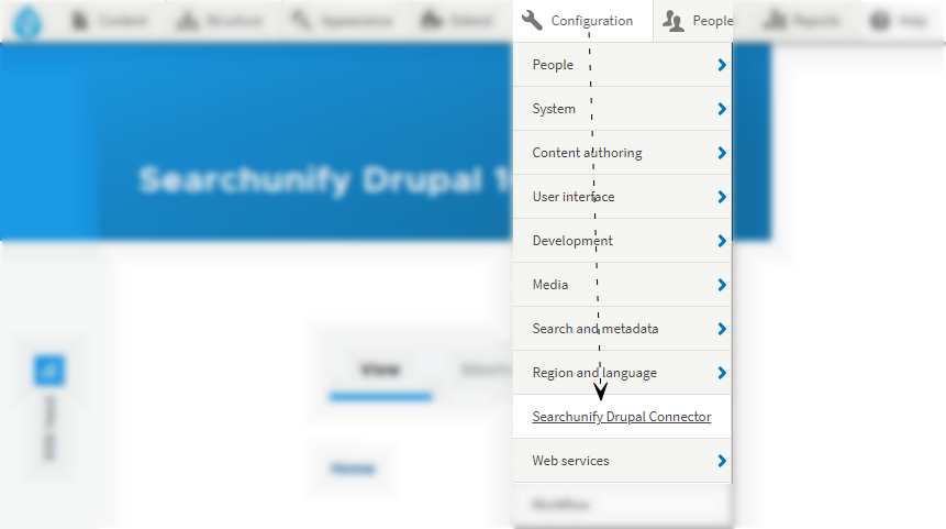 After the SearchUnify-Drupal Connector is installed, hover upon the Configuration tab and select SearchUnify Drupal Connector.