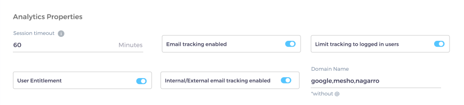 Internal/External Tracking Enabled and Domain Name are related. If you specify, yourcompany.com in Domain Name, then all emails of the type personone@yourcompany.com, persontwo@yourcompany.com are considered internal users. When Internal/External Tracking is turned on, then you can view search analytics data for internal and/or external users separately.