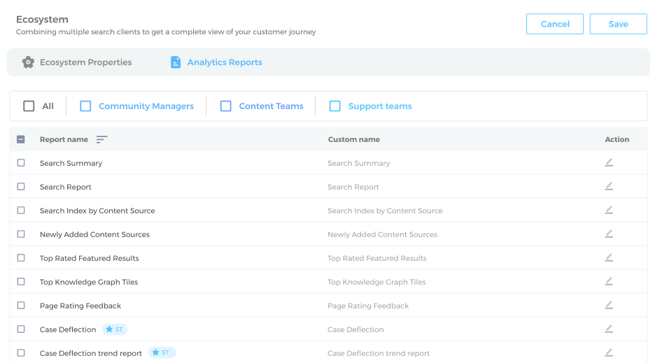 Once you have configured the Ecosystem, jump to Analytics Properties. Here is a list of analytics reports. Choosing them activates them on all the search clients in your ecosystem. Information on the role of each report can be found on Search Analytics. Consult the documentation and return to Analytics Reports to activate one or more reports.