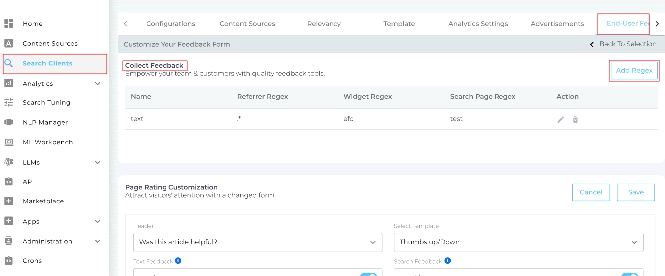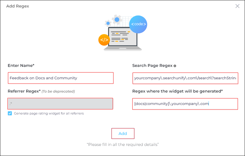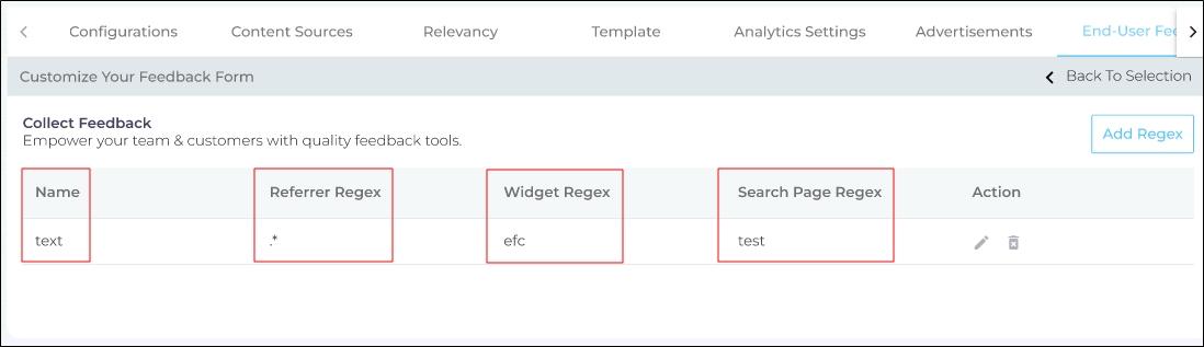 The content feedback widget is displayed only on pages whose URLs match the pattern defined in Add Regex. Configure the following fields:
