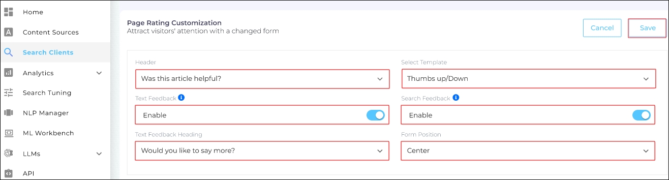 Set the Form Position (where the feedback widget appears on search and content pages). Options: