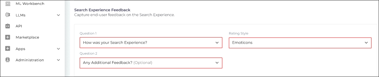 Search Experience Feedback: Configure the feedback widget for the search page. The search feedback shared by the users is captured in the Search Experience Feedback report.
