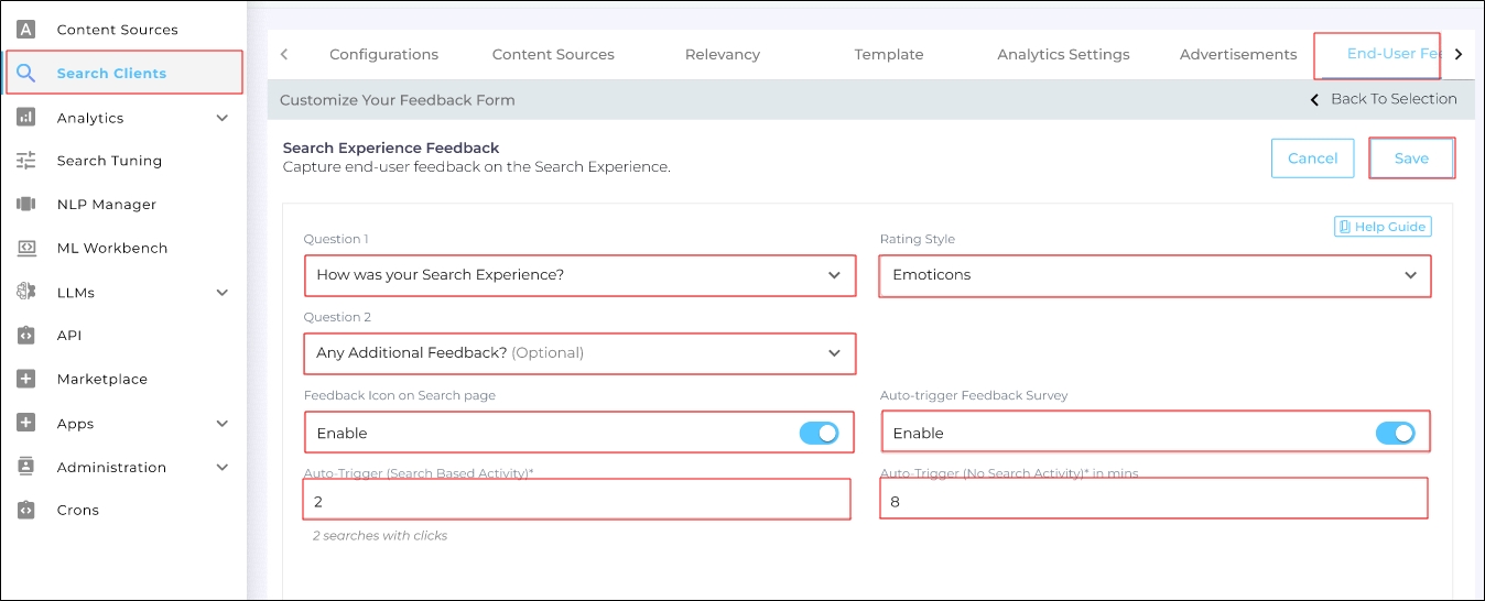 Feedback on Search is a feature in the End-User Feedback tab that allows you to collect user input on search pages in two ways: