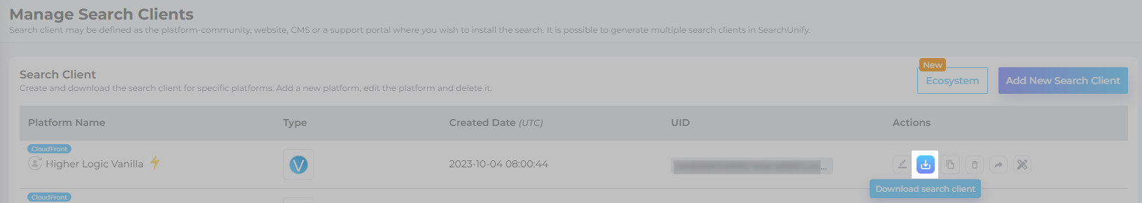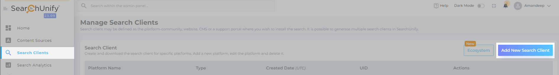 From SearchUnify admin panel, navigate to Search Clients -> Add New Search Client.