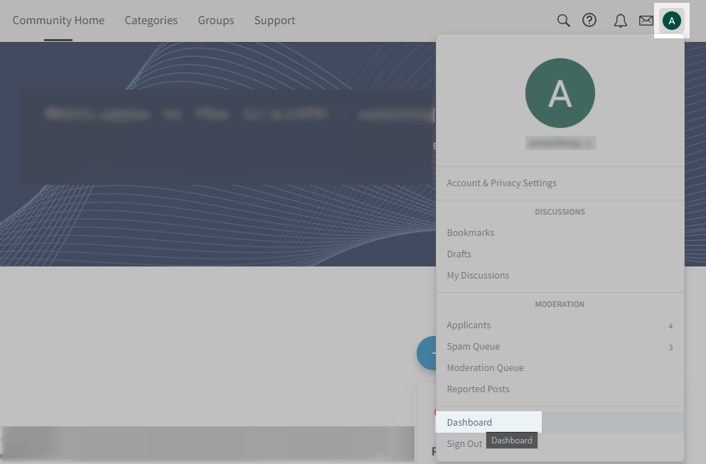 Log into your Higher Logic Vanilla community using the admin credentials. Click on your profile icon and select Dashboard.
