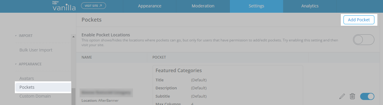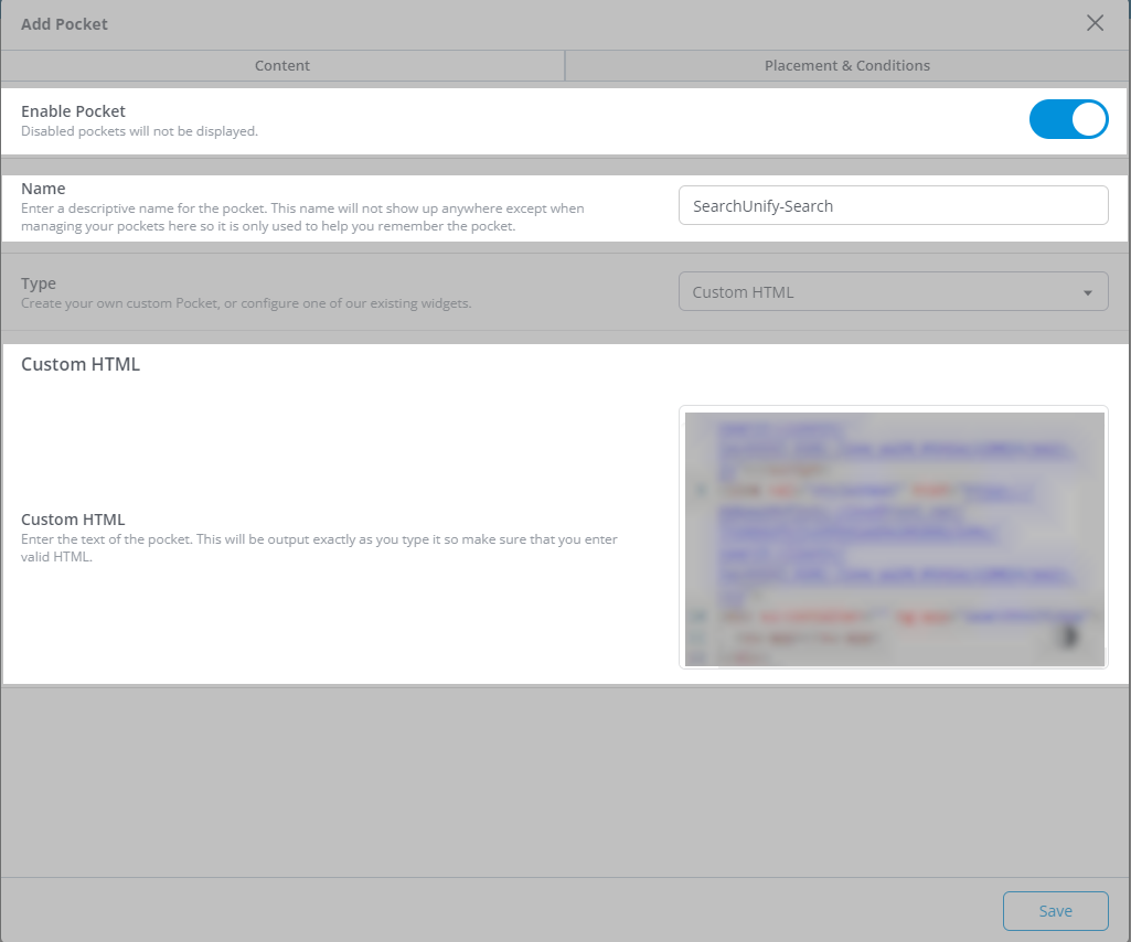 Give the pocket a label and paste the script from index.html file in the Custom HTML field (Refer to step 2). Also, toggle on the Enable Pocket.