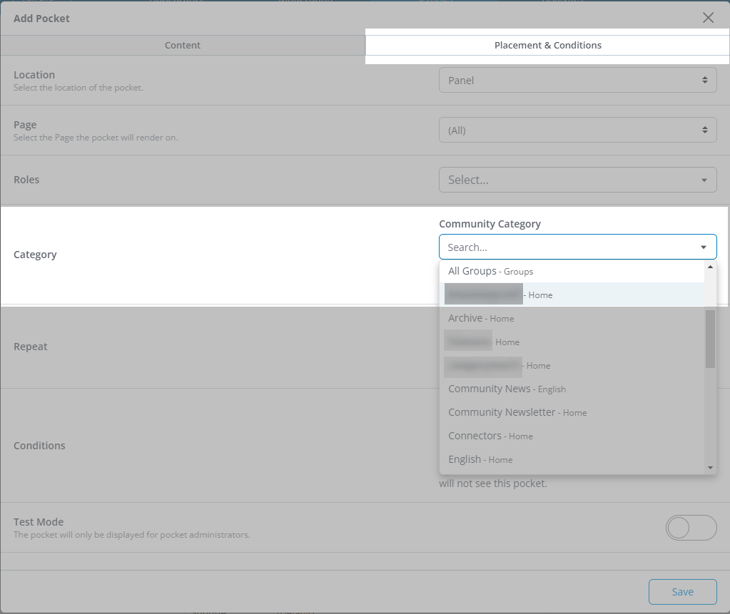 Switch to Placement & Conditions tab. Select the Category to which you want to add the search client.