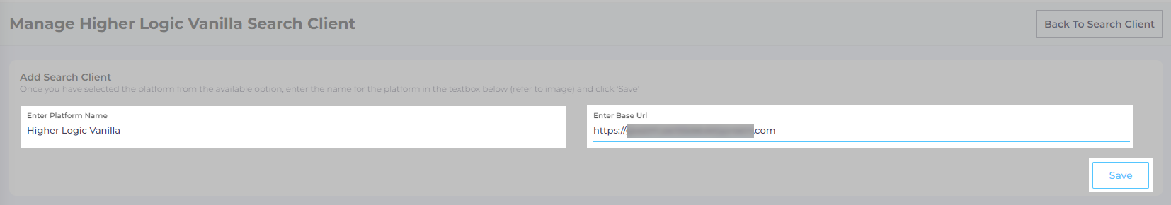 Give your search client a Name and enter the Base URL of your Vanilla platform.