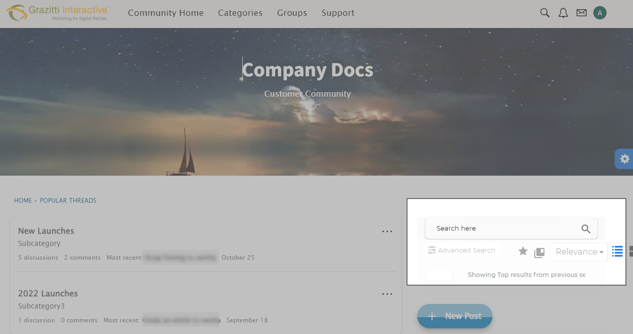 The SearchUnify-powered search bar can be applied to the Categories level in Public Communities only.