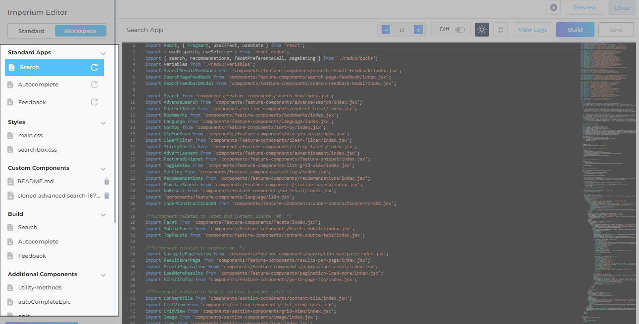 For each search client, Imperium enables customization of frontend components. This tool allows admins to modify nearly every visible aspect of the search client, including the search box, page rating widget, facets, content source tabs, scroll functionality, featured snippets, and bookmarks. By leveraging these features, admins can significantly enhance the user experience