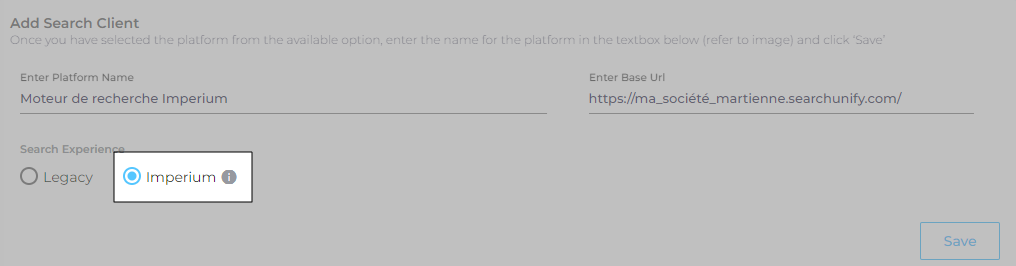 - Select a search client, enter the required details, and then choose Imperium in the Search Experience section.