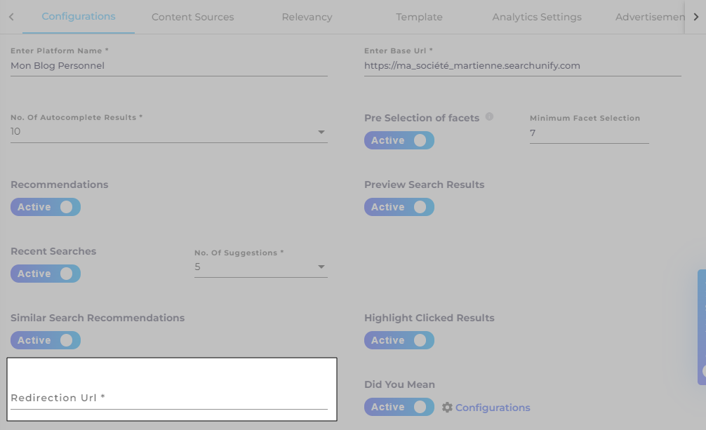 The Redirection URL field, exclusive to Imperium search clients, is available under Search Client > Edit > Configurations. In this field, you can specify the URL to which users will be redirected from the search box, typically the URL of the search page. However, the search client will function properly even if this field is left blank."