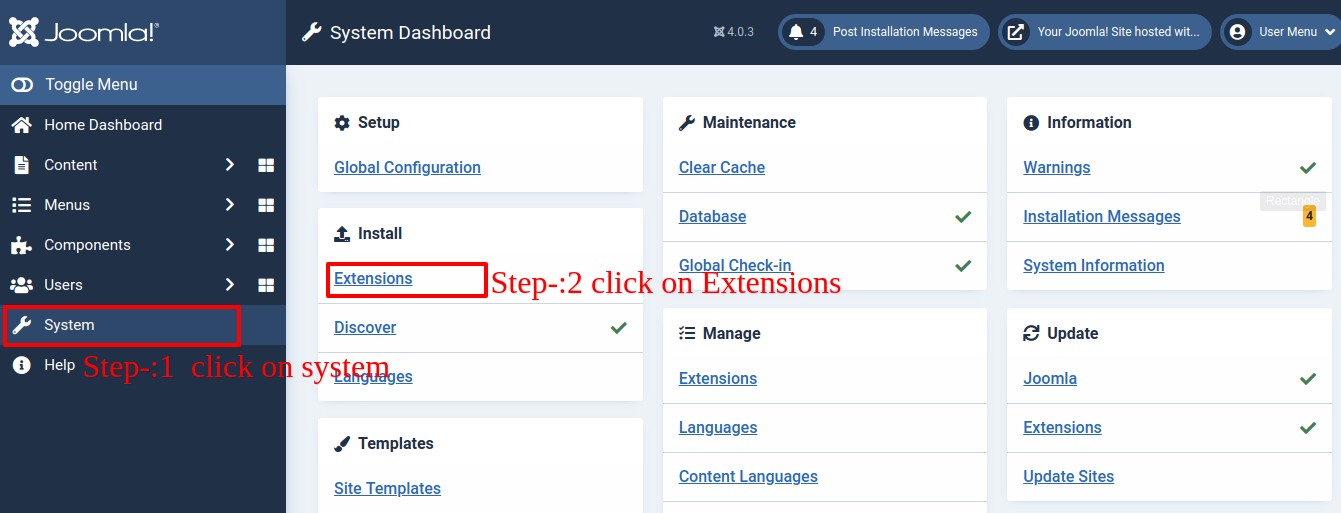 To install the SearchUnify app, click System from the side menu bar and subsequently, click Extensions.