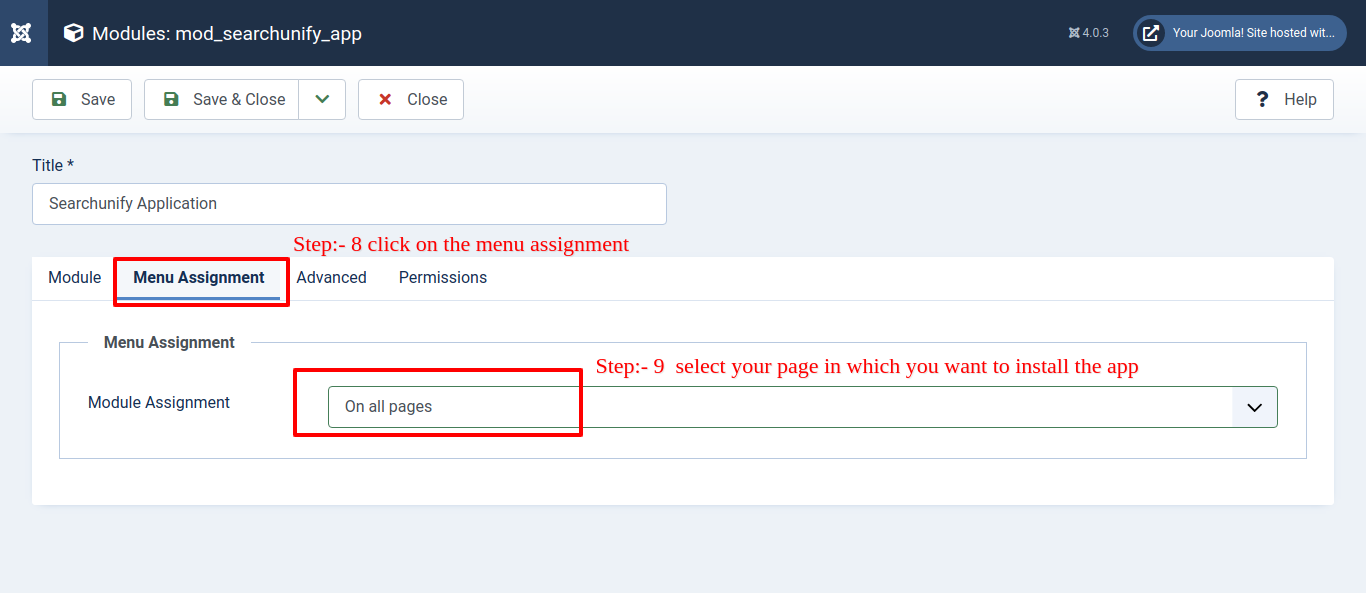 Click on the Menu Assignment sub-tab and select your module assignment, meaning the page on which you want to install the app.