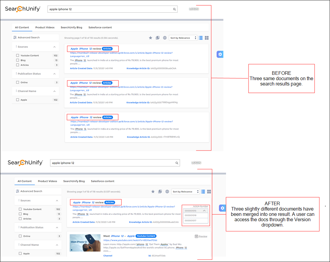 - Versioning Field. This property differentiates the grouped documents. It can be the article ID or the published date. The unique property value is used in the dropdown to distinguish the grouped results. In the example below, the article ID is used to differentiate the grouped results.