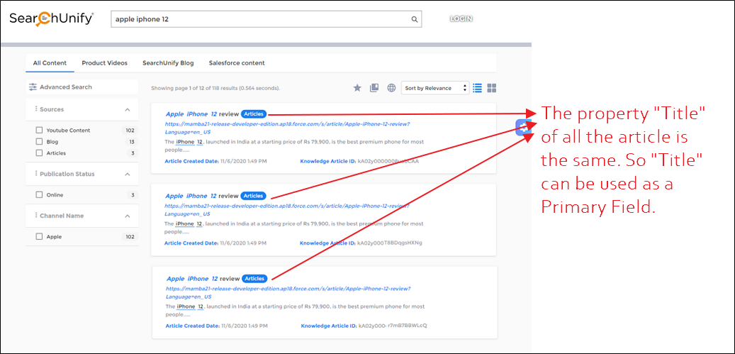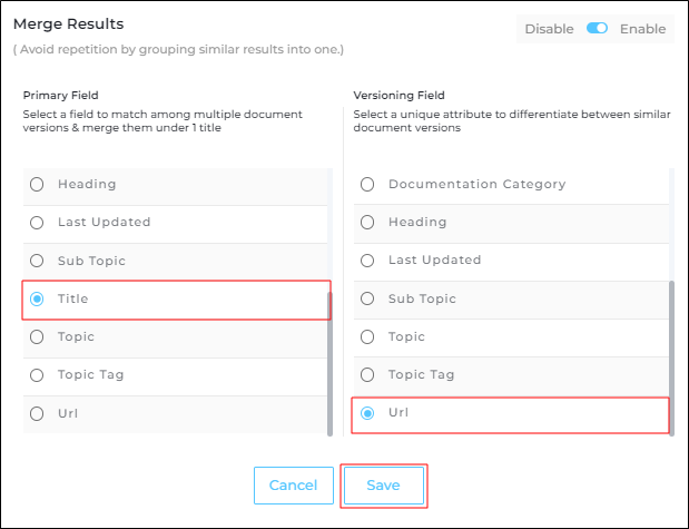 - Select a property from the Primary Field and a property from the Versioning Field and save the settings. The settings in the image ensure that any articles with the same title but different URLs are merged into one result.