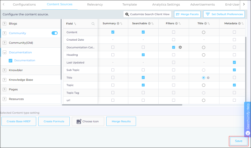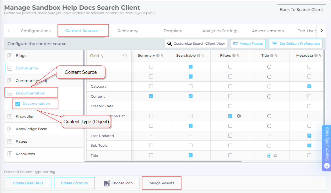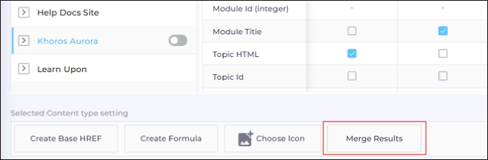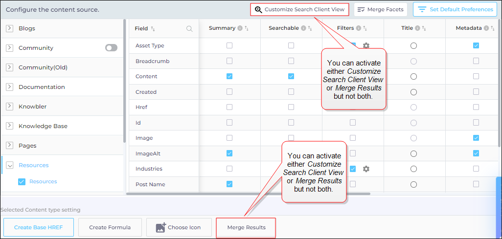 - In the Content Sources tab, expand a content source, select a content type, and select Merge Results.