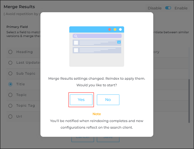 Click Yes to crawl the content source again. The merged results will be visible after the reindexing.
