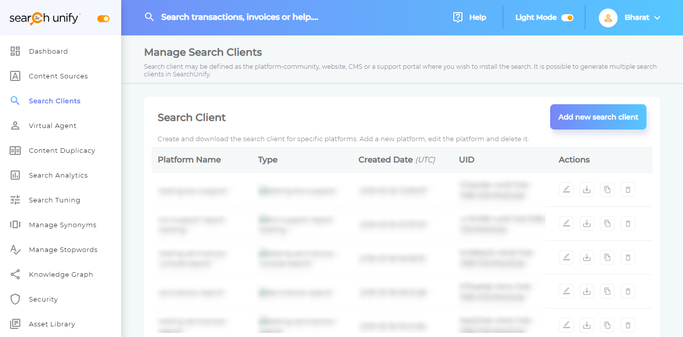 - Log into SearchUnify, navigate to the menu bar on the left, and click Search Clients.