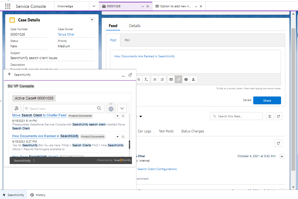 copies a hyperlinked result title in Salesforce Lightning. In Salesforce Lightning, the link contains the URL of the copied result, which can be pasted on a case page. In the next image, the second result "How Documents Are Ranked in SearchUnify" is copied from the search client and pasted on a case page.