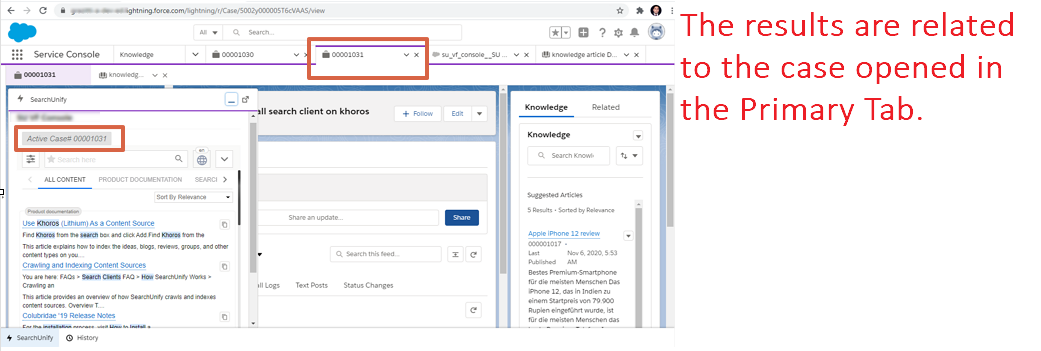 When the search client is launched, it presents results related to the case opened or active in the Primary Tab. When you switch between two Primary Tabs, the results page refreshes — so that the results are related to the active case. Navigation between subtabs doesn't refresh results. It means that you can use the search function in subtabs.