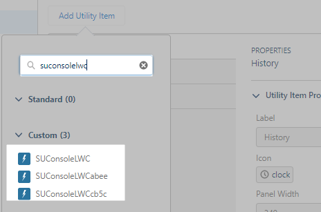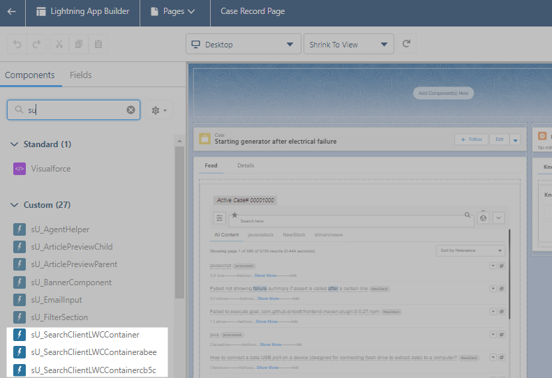 Add the component SUConsoleLwc{{ABCD}}. The last four letters of the component contain the first four letters of the search client UID.