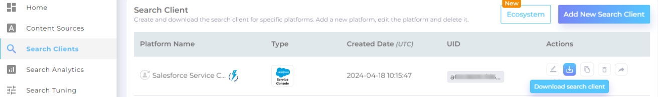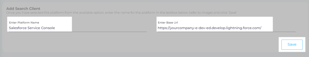 Create a Salesforce Service Console search client. Log into your instance, go to Search Clients, pick "Salesforce Service Console", enter a label in Enter Platform Name and your instance URL in Enter Base URL.Then, click Save.