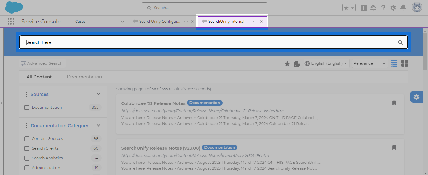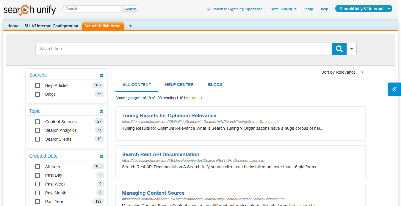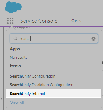 - From the app launch menu, go to SearchUnify Vf Internal.