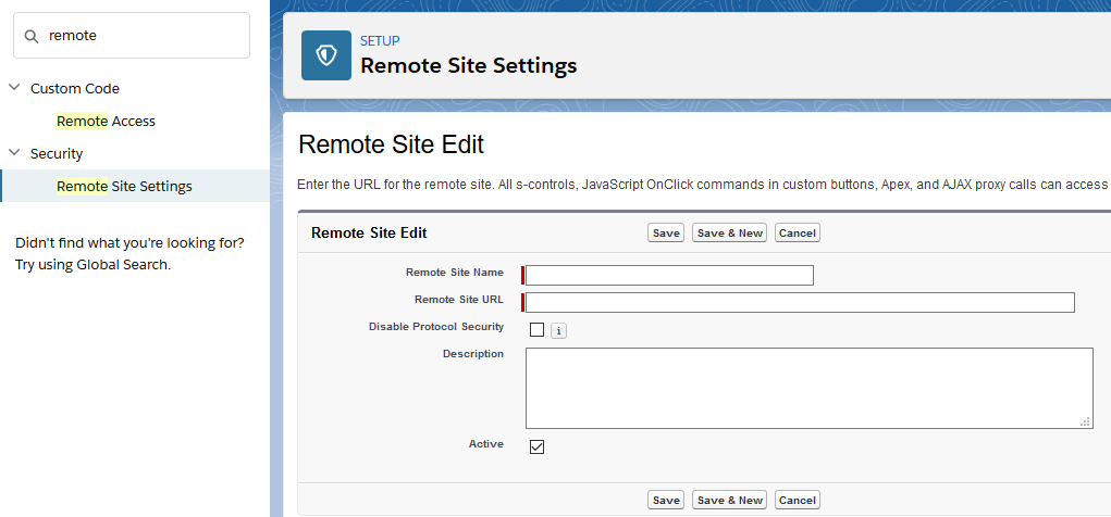 - Go to Remote Site Settings from the quick find box in Setup.