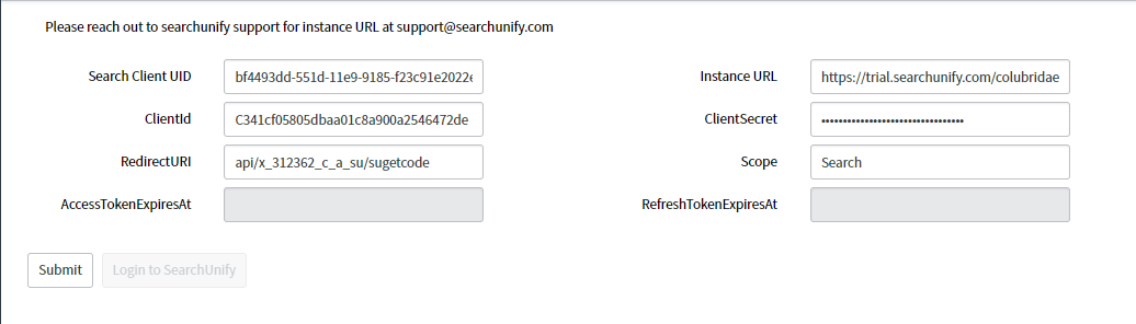 - Enter Search Client UID, Client ID, Client Secret, and Instance URL and press Submit. (The Instant URL is the web address of your SearchUnify dashboard.)
