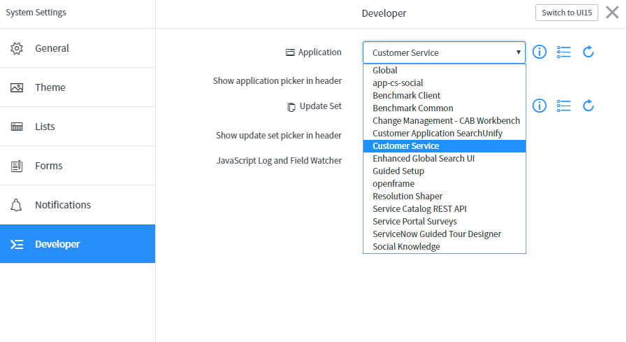 , navigate to Developer, and select Customer Service from the Application dropdown.